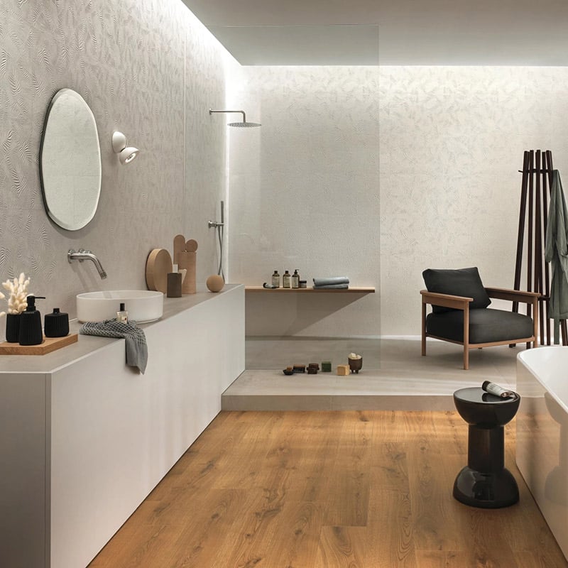 Per quanto riguarda le finiture, è possibile lavorare le piastrelle mediante un processo di levigatura per ottenere un effetto lucido e brillante, oppure mantenere intatte queste piccole irregolarità per una superficie opaca. E ancora, la nuova finitura silk offre un compromesso perfetto tra matte e lucido per una superficie setosa al tatto che riflette dolcemente la luce.